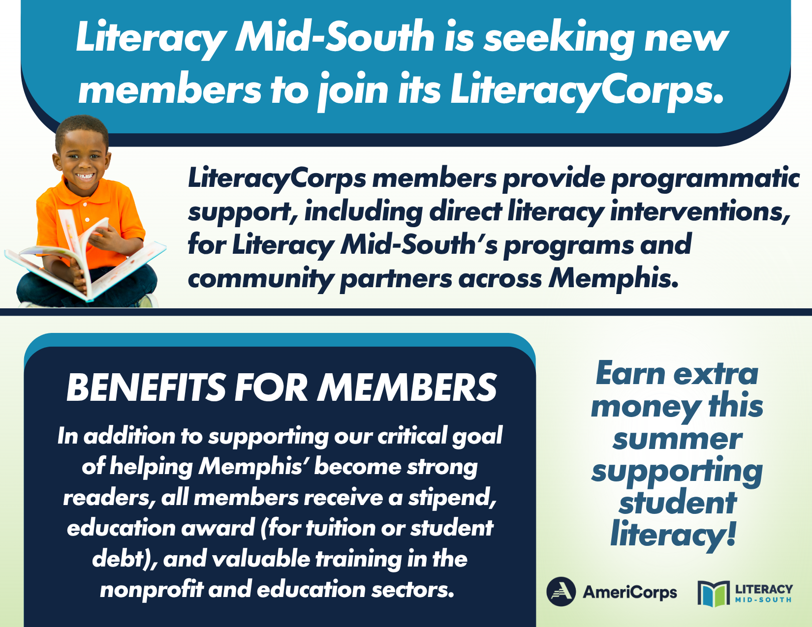 Embraces the AmeriCorps Spirit of Service; seeks to serve where needed in order to support Literacy Mid-South and its partners programming & youth participants